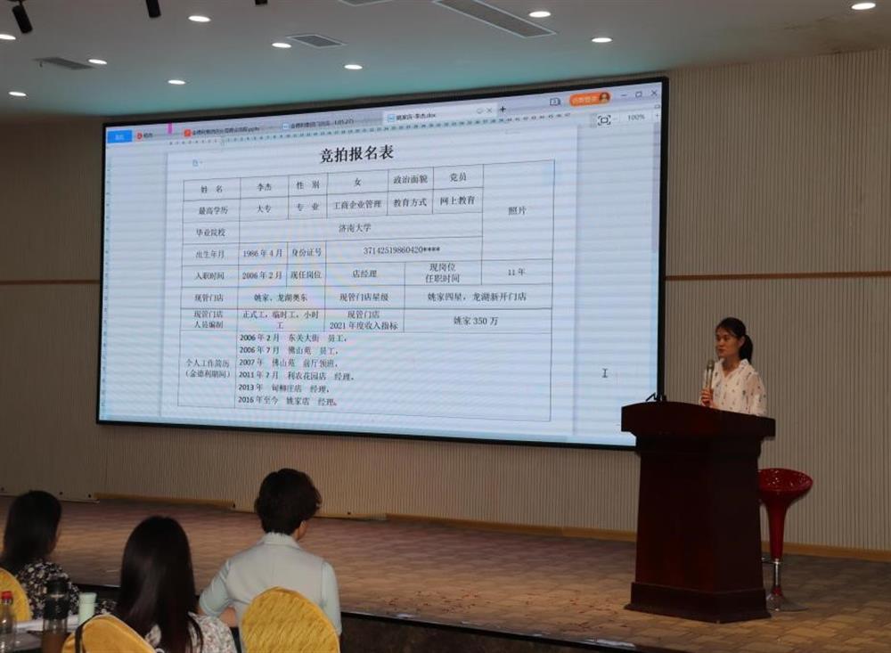 公司成立競拍領(lǐng)導(dǎo)小組,堅(jiān)持“公開競拍、平等競爭、擇優(yōu)錄取、注重實(shí)績”的原則,鼓勵員工毛遂自薦、積極報名。競拍店長依次上臺分別從管理門店2021年度經(jīng)營收入目標(biāo)、競拍上崗后的工作思路、設(shè)想及經(jīng)營措施等方面進(jìn)行演講。